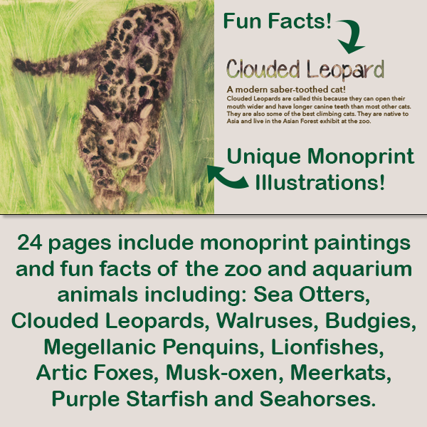 A delightful book full of images of a day at the Point Defiance Zoo and Aquarium. Each unique monoprint illustration depicts another animal and is accompanied by some fun facts. Beautiful illustrations and fun information make this a great book for the whole family to enjoy.
