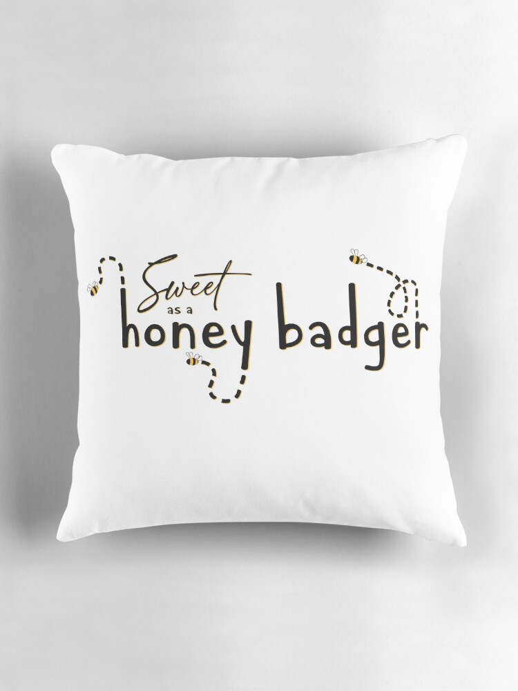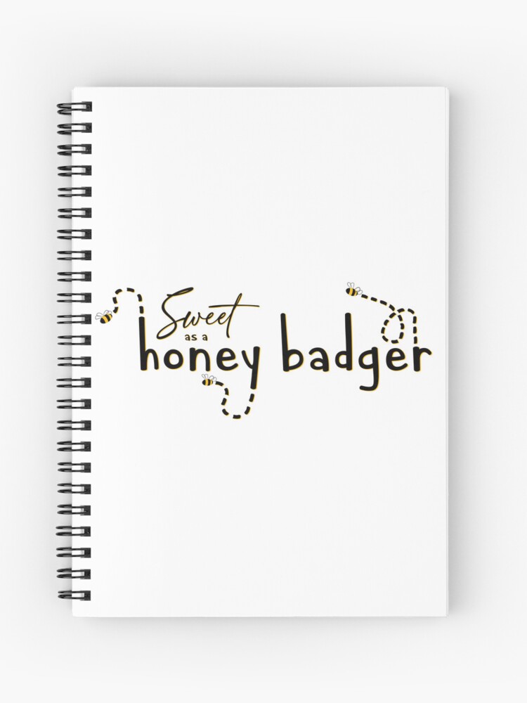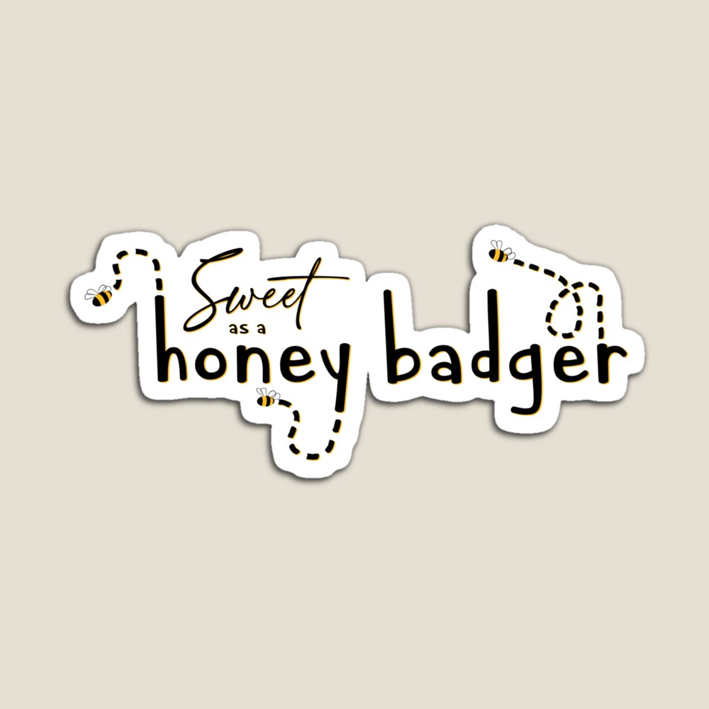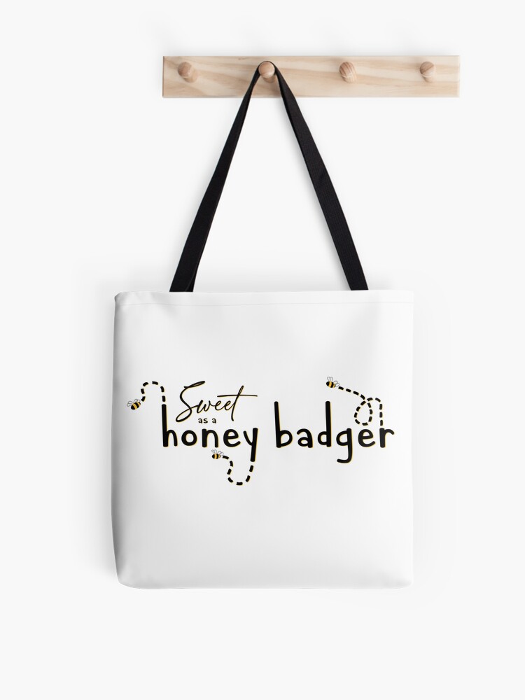 Available on Redbubble, isolated text and illustration design featuring small bees flying around the words “Sweet as a honey badger.” All text and graphics are in black and a deep yellow color- isolated, so they will show up best on lighter colored items.