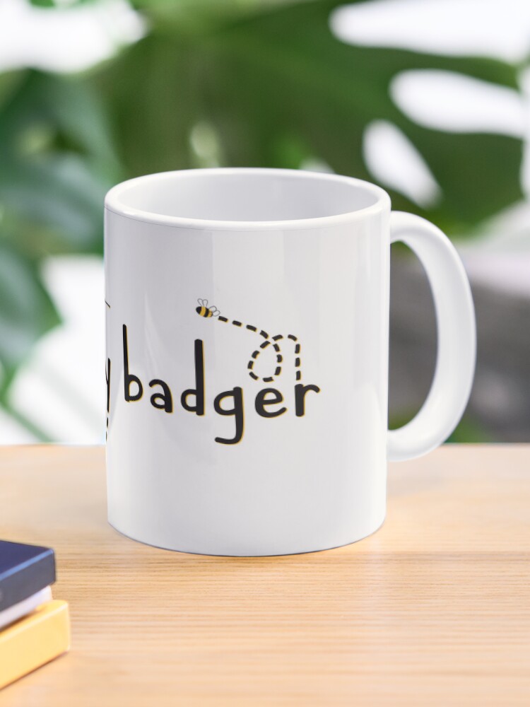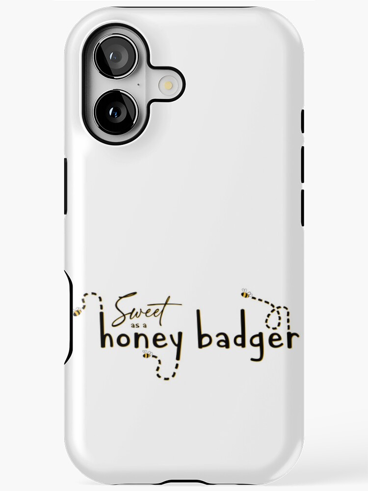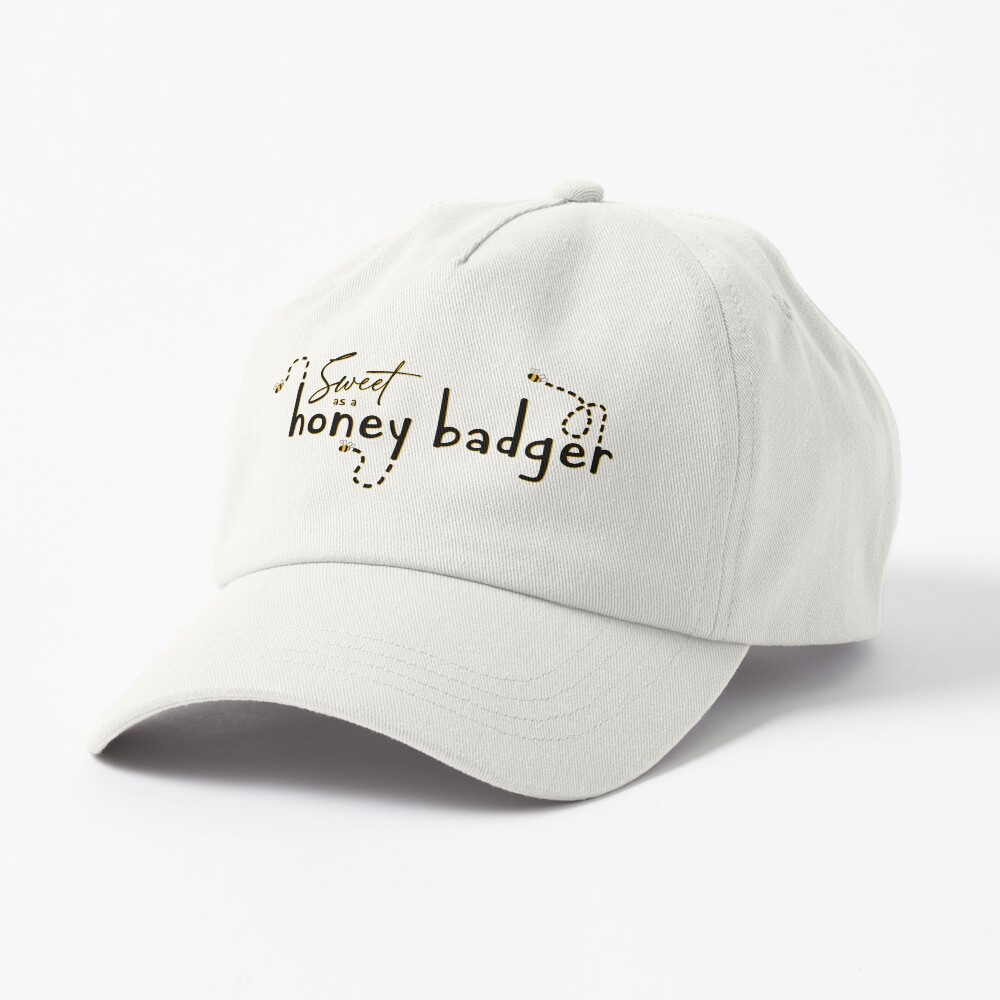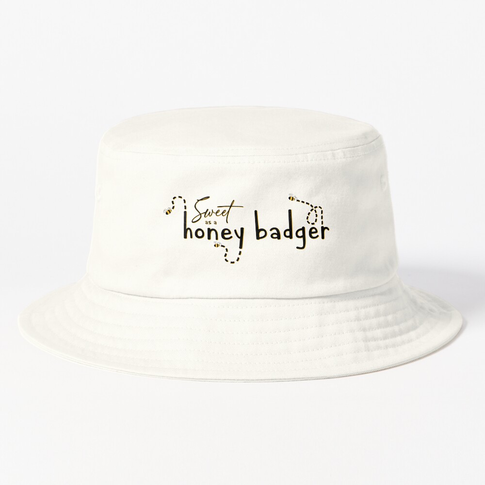Available on Redbubble, isolated text and illustration design featuring small bees flying around the words “Sweet as a honey badger.” All text and graphics are in black and a deep yellow color- isolated, so they will show up best on lighter colored items.